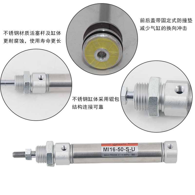 4、不銹鋼材質(zhì)活塞桿與缸體,使迷你氣缸能適應(yīng)一般腐蝕性工作環(huán)境;