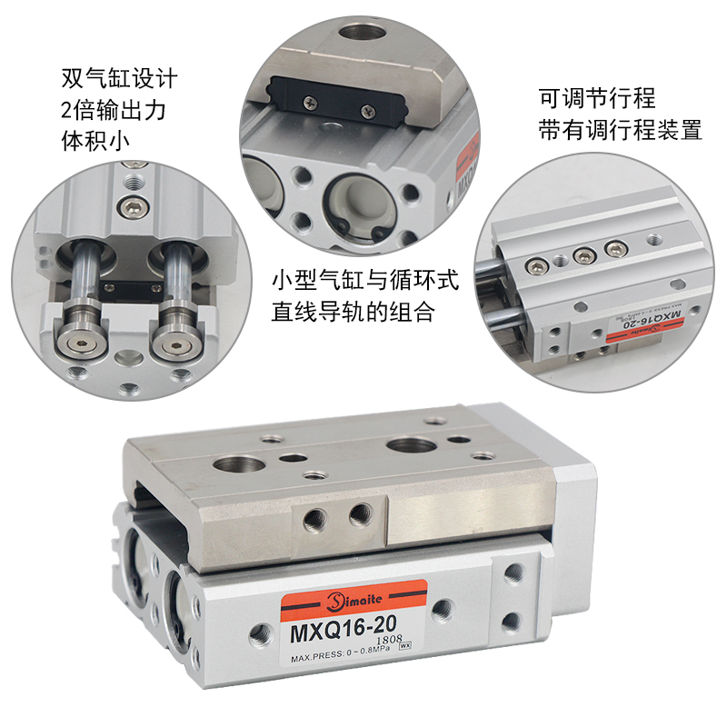 3、MXQ系列滑臺(tái)氣缸采用雙氣缸設(shè)計(jì),2倍輸出力,負(fù)載力矩大。