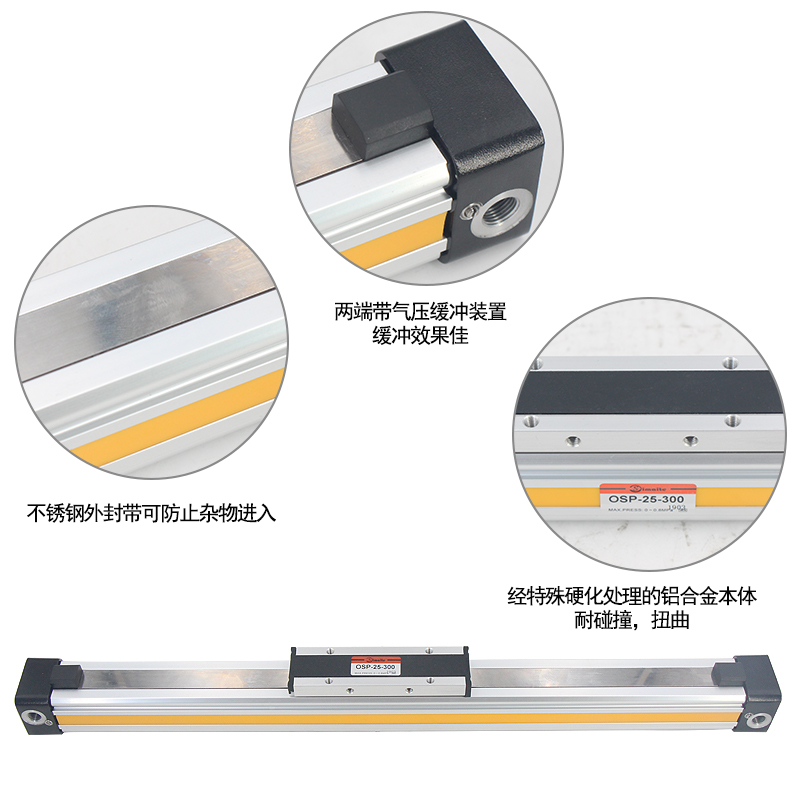 1、OSP機械式無桿氣缸節(jié)省一半的安裝空間,安裝簡便,傳動效率高;