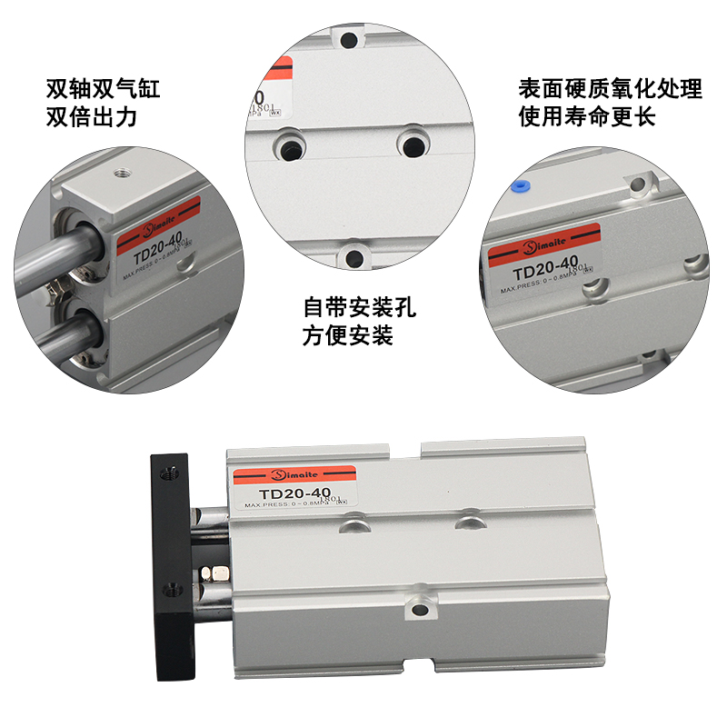 1、TD系列雙軸氣缸是雙軸雙氣缸,實(shí)現(xiàn)雙倍出力;